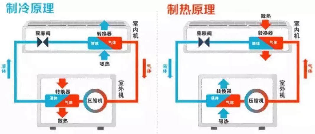 “制熱模式”則是相反的過程,壓縮機內氣態的制冷劑進入的是室內的交換器,變成液體,放出熱量。